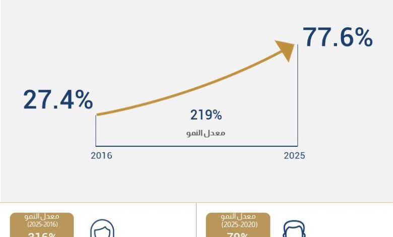 وكشفت المؤشرات الرئيسية الصادرة عن قاعدة بيانات الشمول المالي بالبنك المركزي عن زيادة في معدلات الحصول على الخدمات المالية، حيث شهدت نسبة الشمول المالي للمرأة طفرة ملموسة لترتفع من 19.1 % عام 2016 إلى 71.4% بنهاية 2025، بمعدل نمو 316% خلال تلك الفترة، كما زادت معدلات الشمول المالي للشباب في الفئة العمرية (15-35) حيث ارتفعت من 36.3 % في 2020 إلى 56.8 %، بمعدل نمو79 % خلال نفس الفترة، وجاء ذلك بدعم من إطلاق برامج ومشروعات خاصة لتعزيز التمكين الاقتصادي للمرأة والشباب، وزيادة مشاركة الفئات الأكثر احتياجًا في النظام المالي الرسمي.