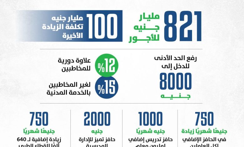 أضاف الوزير، أن الزيادة الجديدة ترفع الحد الأدنى للدخل للعاملين بالدولة إلى ٨ آلاف جنيه، مشيرًا إلى إقرار ١٢٪ علاوة دورية للمخاطبين بقانون الخدمة المدنية و١٥٪ لغير المخاطبين، وزيادة الحافز الإضافي لكل العاملين بـ ٧٥٠ جنيهًا شهريًا بتكلفة إجمالية ٧٧,٥ مليار جنيه.
