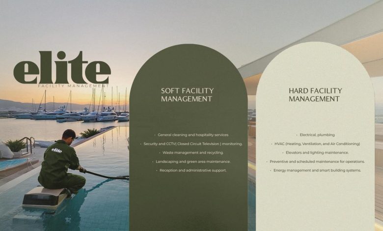 إدارة المرافق الخدمية (Soft FM): التنظيف والضيافة، الأمن والمراقبة، إدارة النفايات وإعادة التدوير، تنسيق الحدائق، وخدمات الاستقبال والدعم الإداري.